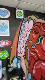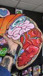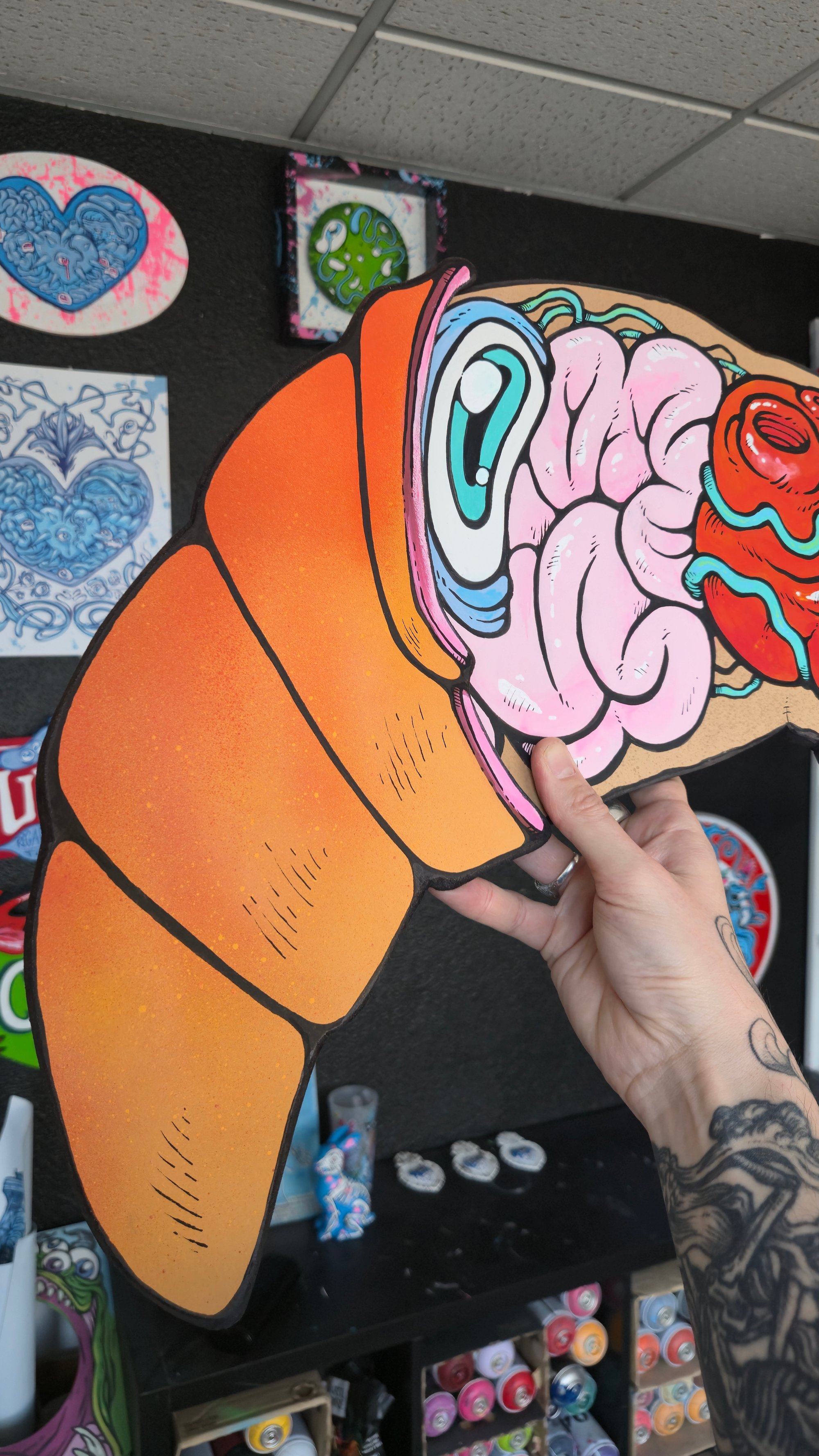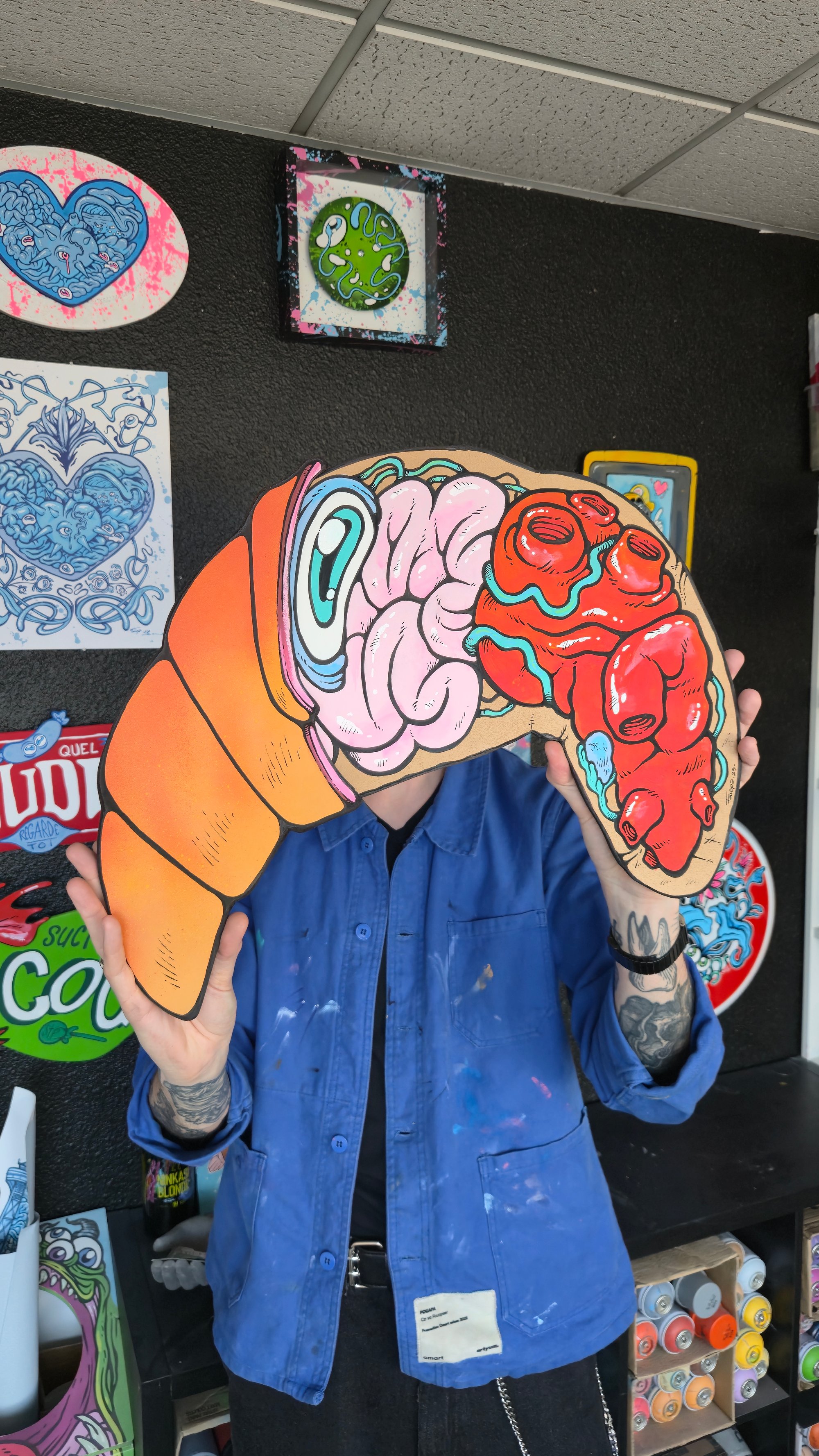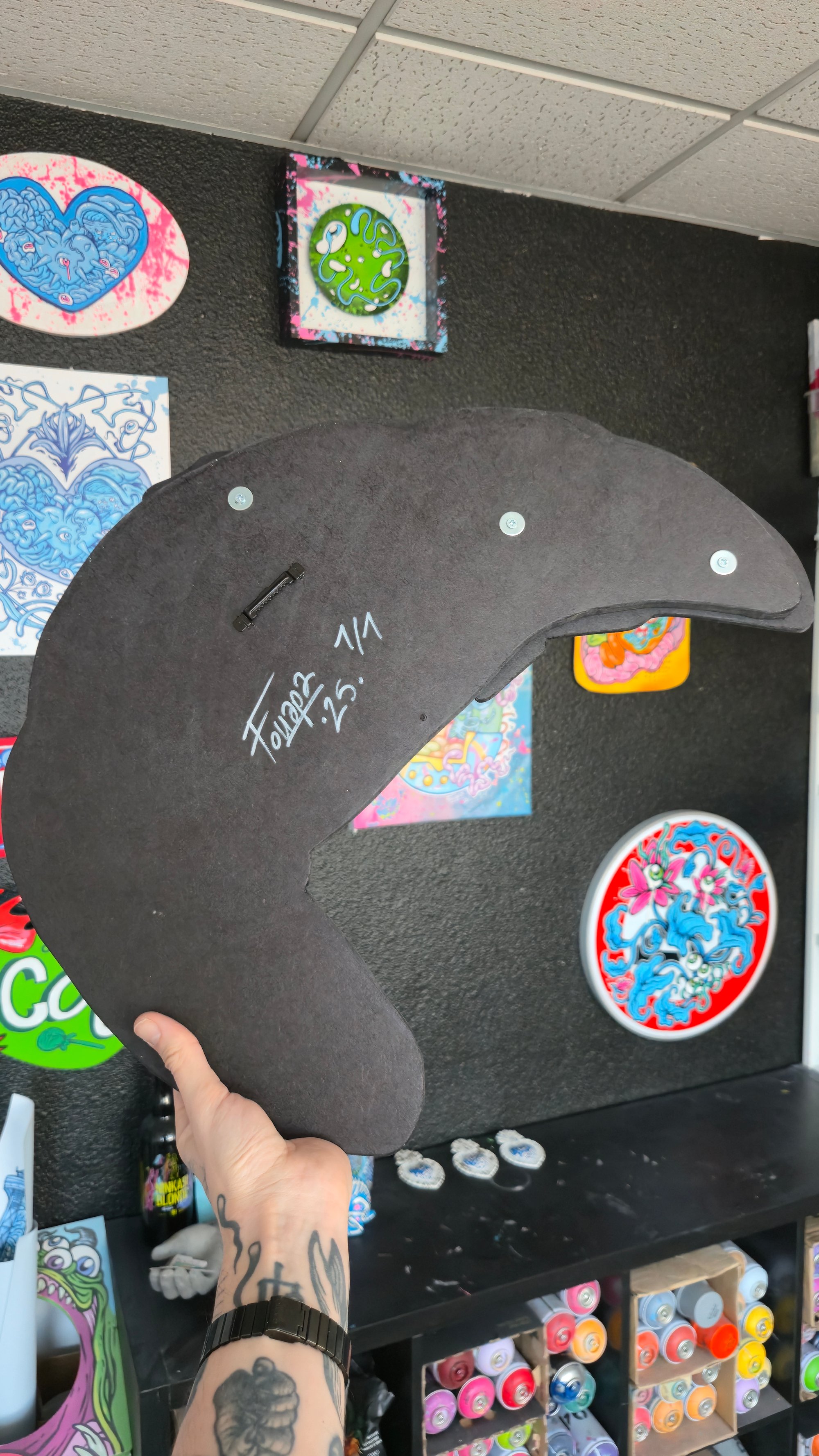 Spray, acrylique et posca sur planches de bois découpées à la main. Numéroté et signé, accroche au dos.