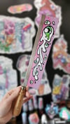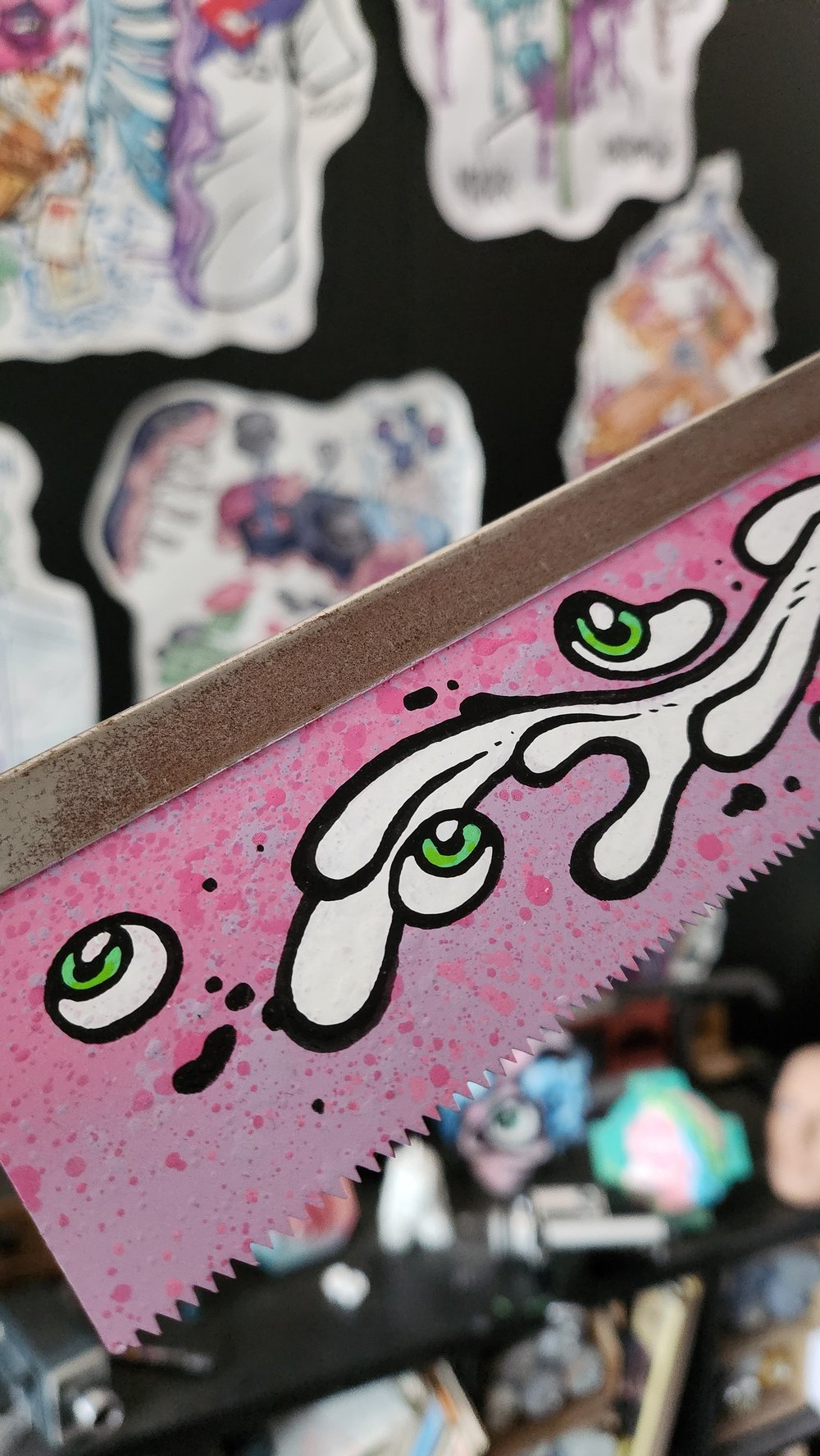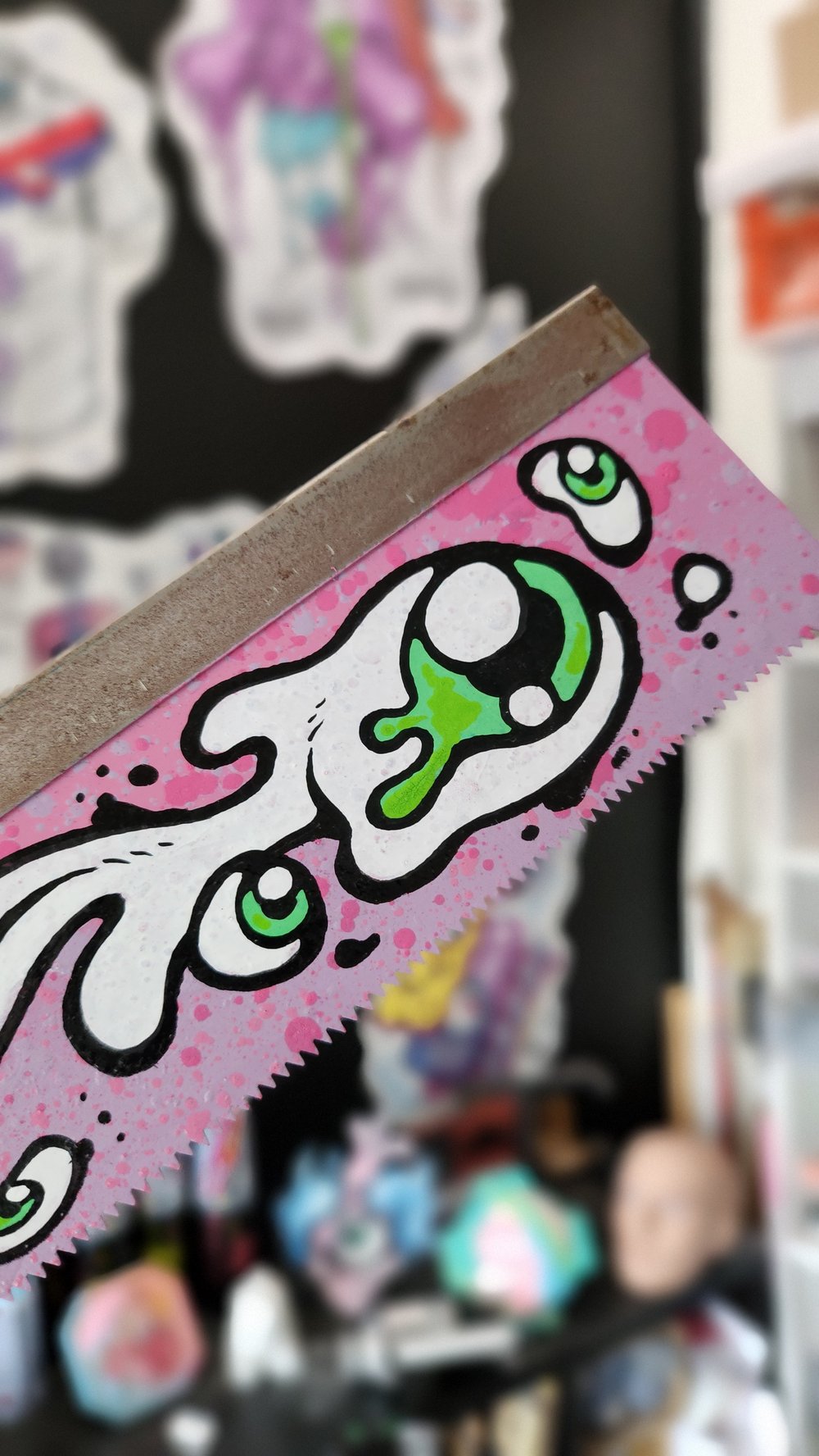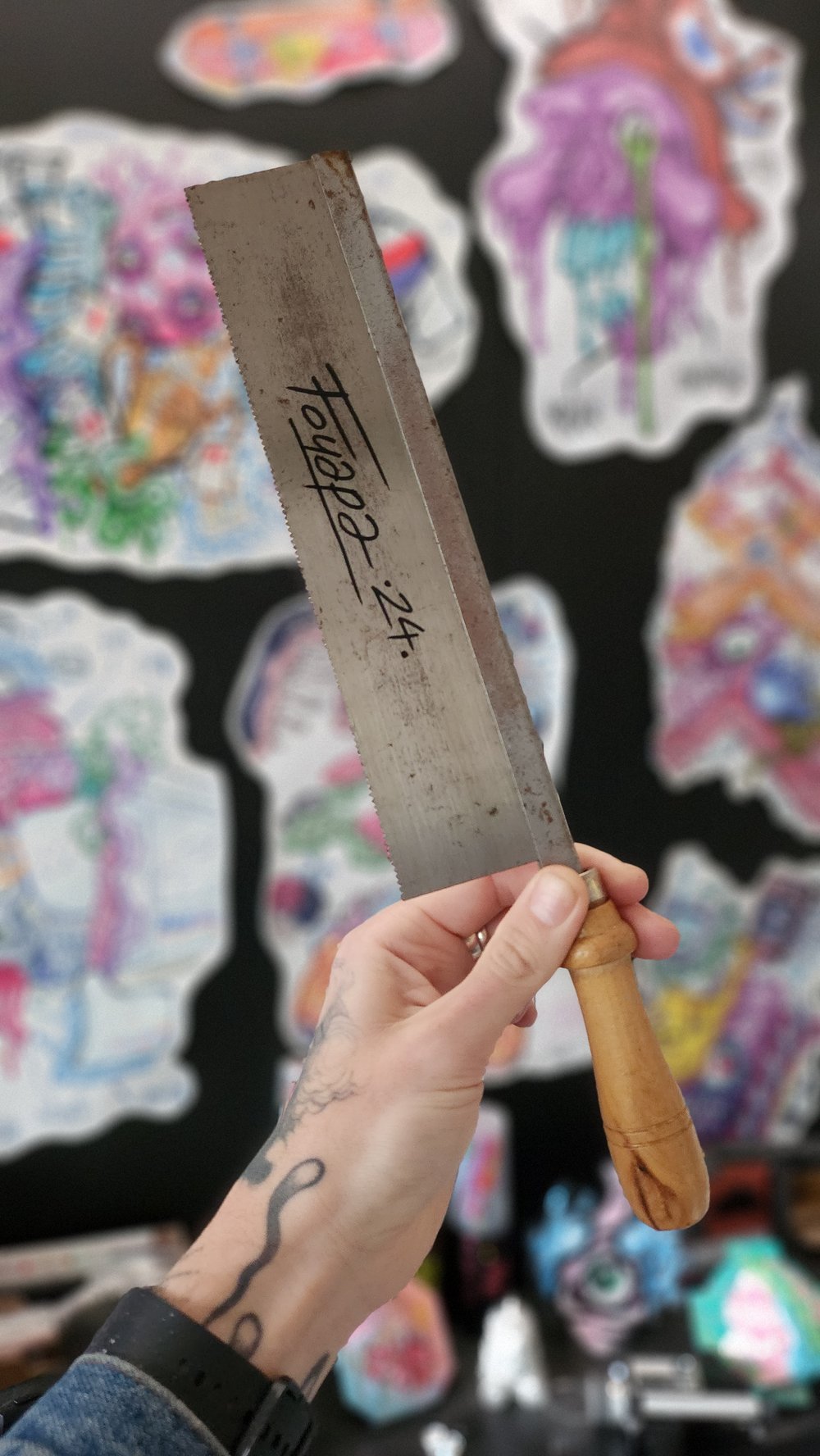 Spray, acrylique et posca sur scie en métal et bois. Signé et vernis